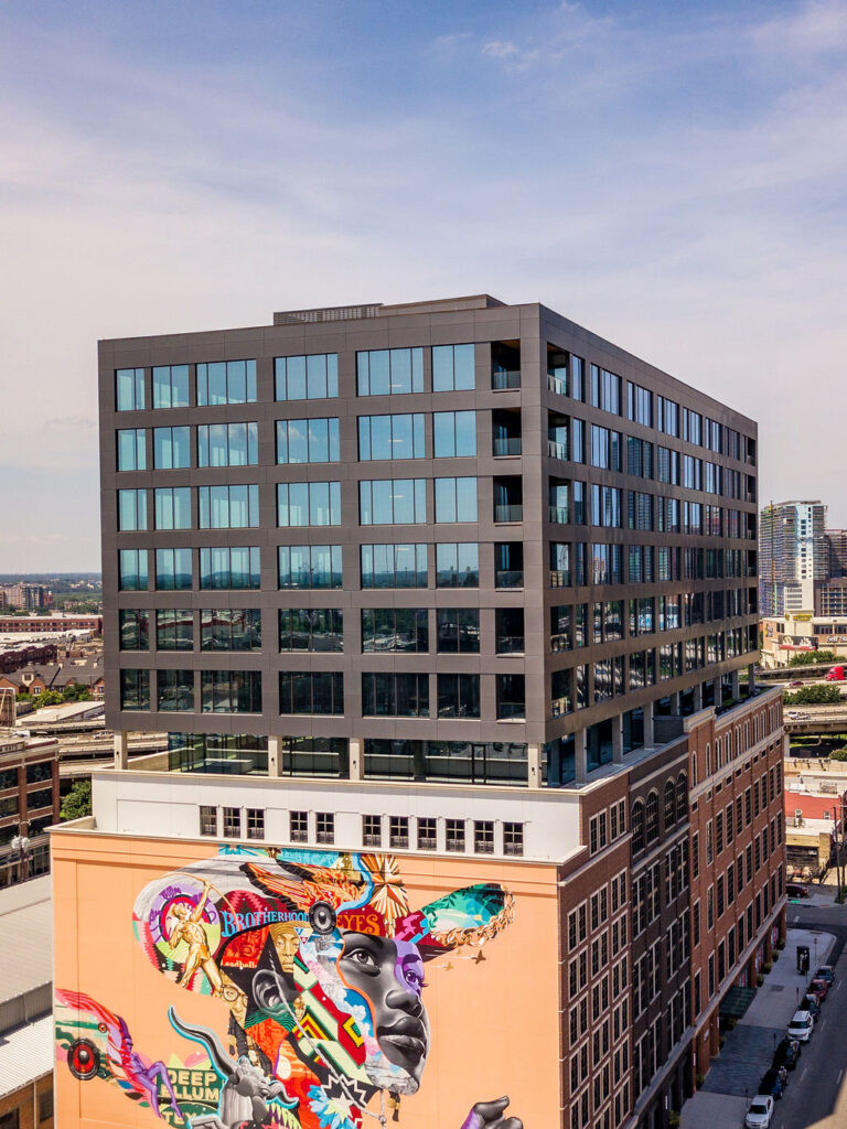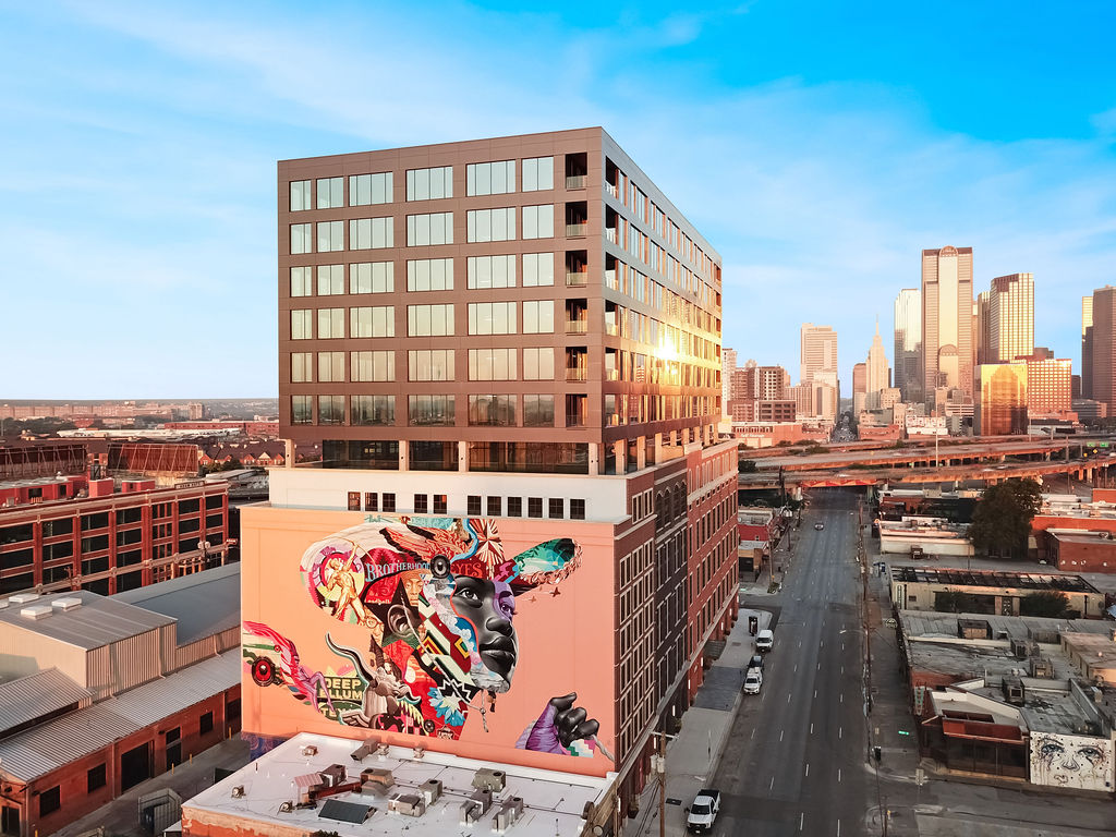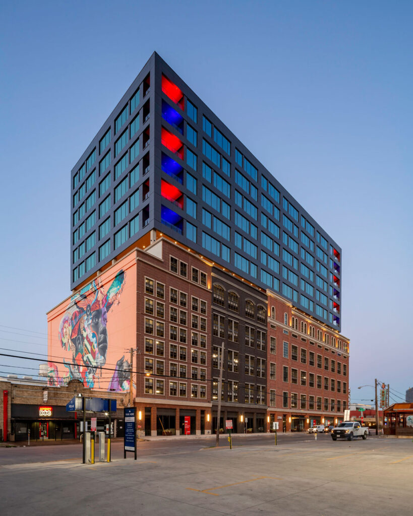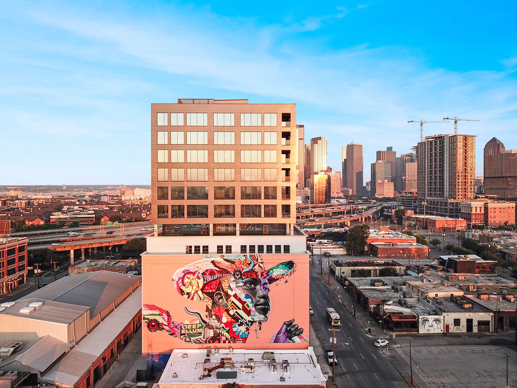 The Stack paid homage to the neighborhood’s thriving visual arts scene by commissioning American street artist Tristan Eaton in collaboration with Goldman Global Arts to create a massive “Modern Cowgirl” mural for the building as well as local artists in collaboration with The Deep Ellum Foundation to decorate an alleyway with a series of united murals recognizing the area’s blues music tradition. A dynamic LED lighting system allows The Stack’s façade lighting to be changed in support of local sports teams and causes.