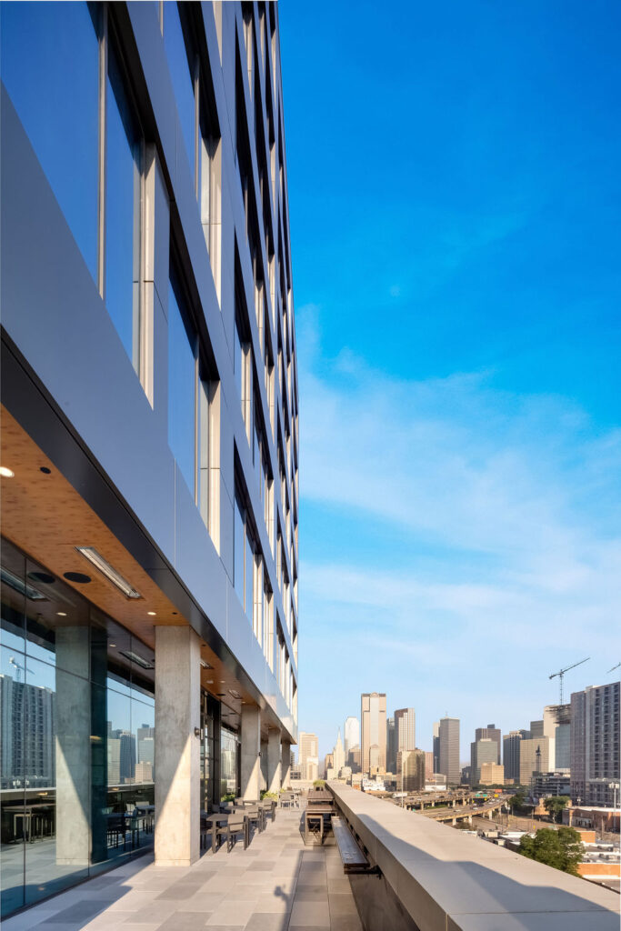 “The lower building volume blends with Deep Ellum’s historic neighborhood and shows respect for the neighborhood’s history of brick and mortar architecture, while the upper building volume aesthetically expresses the goal of creating an innovative office model for the future with its modern aesthetic and visual prioritization of outdoor amenity spaces for the building’s occupants,” said Christine Robbins-Elrod, AIA, LEED AP BD+C | ND | Homes, WELL AP, GACP, and principal at 5G Studio Collaborative.