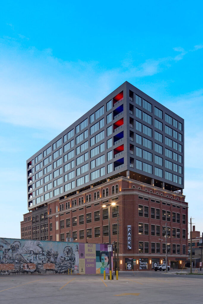 The unique façade design of The Stack Deep Ellum – a new 16-story 215,000 square-foot mixed-use office, retail and parking development – reflects the dynamic nature of this historic Dallas neighborhood, which transitions from daytime office, art gallery and café spaces to nighttime entertainment, happy-hour and evening-only dining venues