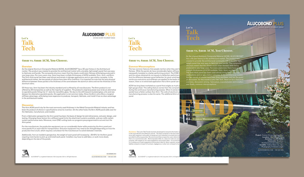 As the original Aluminum Composite Material (ACM), ALUCOBOND® has a 50 year history in the Architectural market. The product was created to provide the architectural market with a durable, light-weight panel that was easy to fabricate and handle. The composite structure meant that the sheets could retain flatness while being produced in very large sizes. For many years now, there have been multiple thicknesses of ACM available: 3mm, 4mm, and 6mm.