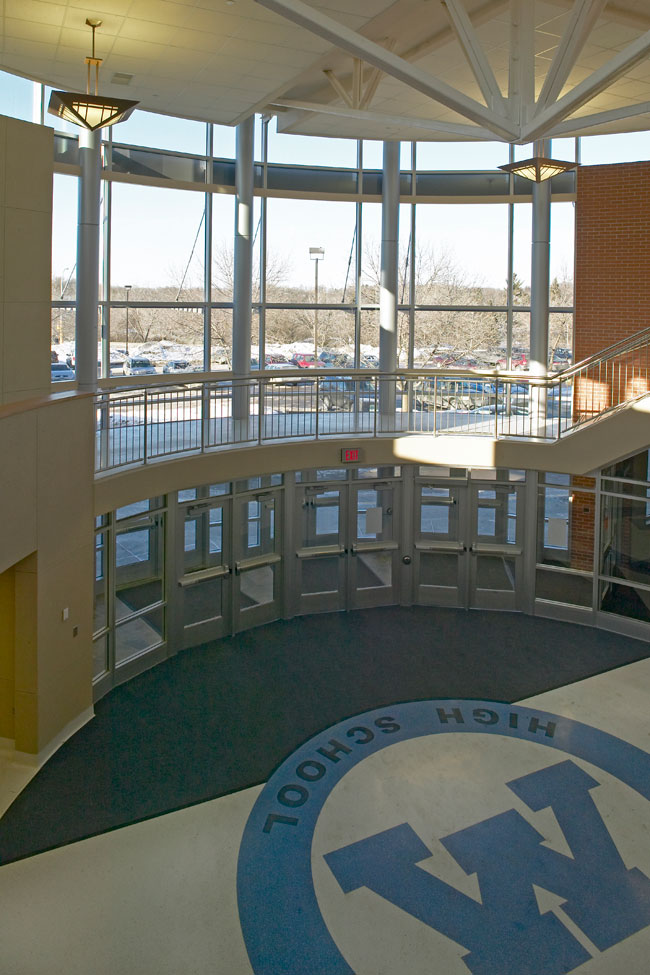 The Minnetonka, Minn., High School is considered the flagship of Minnetonka Public School District #276, which serves approximately 8,400 students in grades K-12 in this suburban community located just eight miles west of Minneapolis in Hennepin County.  As such, it was the first among the district’s schools to receive a facelift completed in January 2009 that included a secure entry and office space within a two-story beacon-like rotunda.