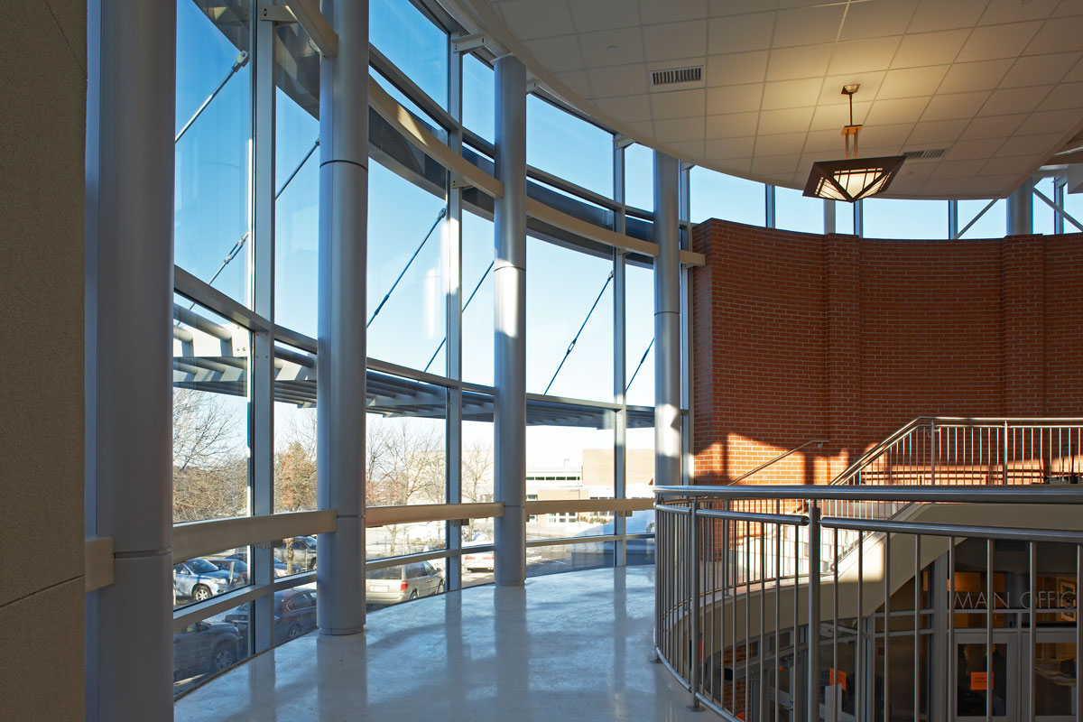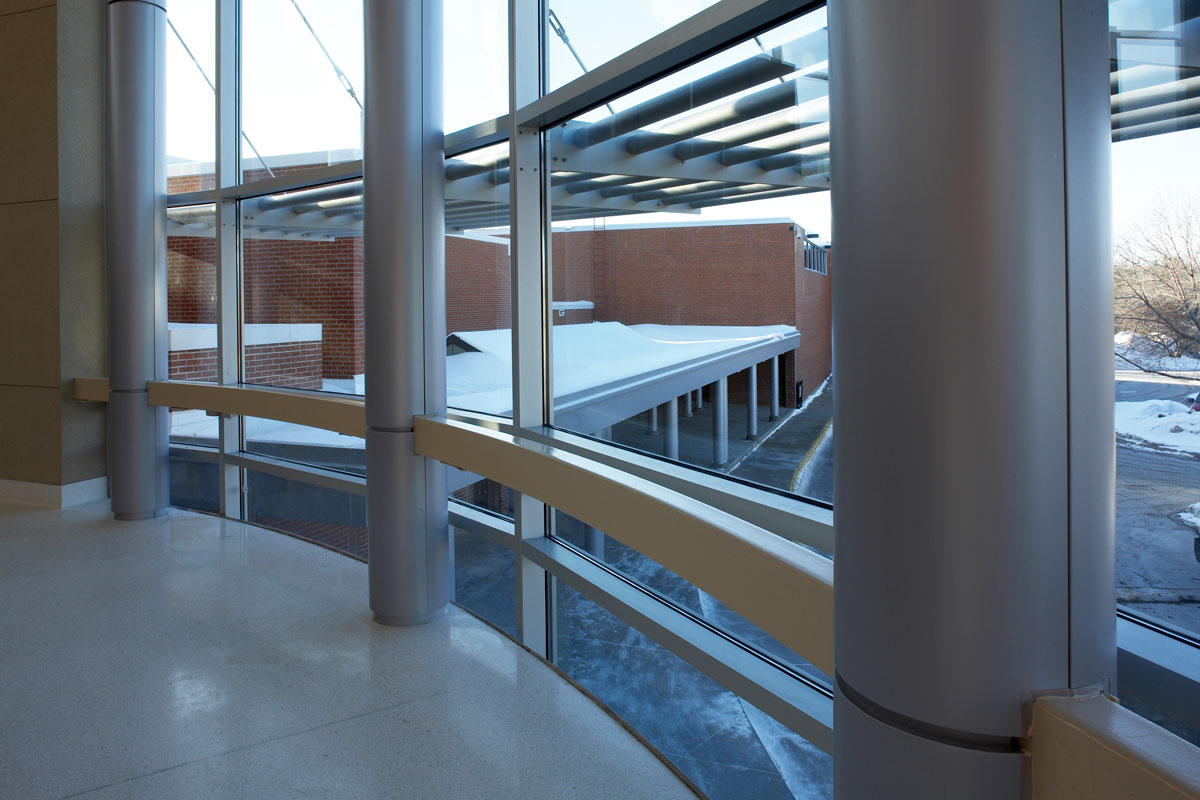 The entire entry at the Minnetonka High School was torn out and replaced with a two-story glass-filled entryway that “glows like a beacon,” according to Magney.  “We used this architectural element to create an obvious and welcoming entry symbol.”