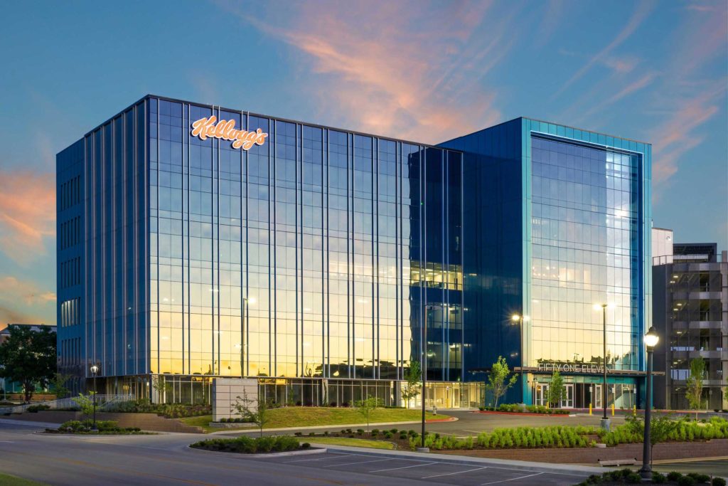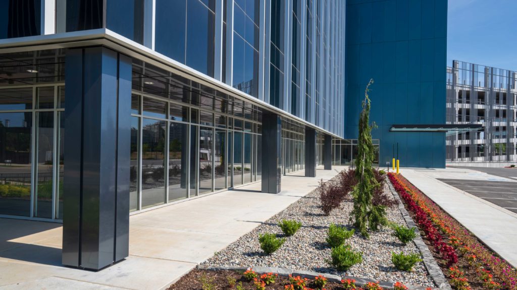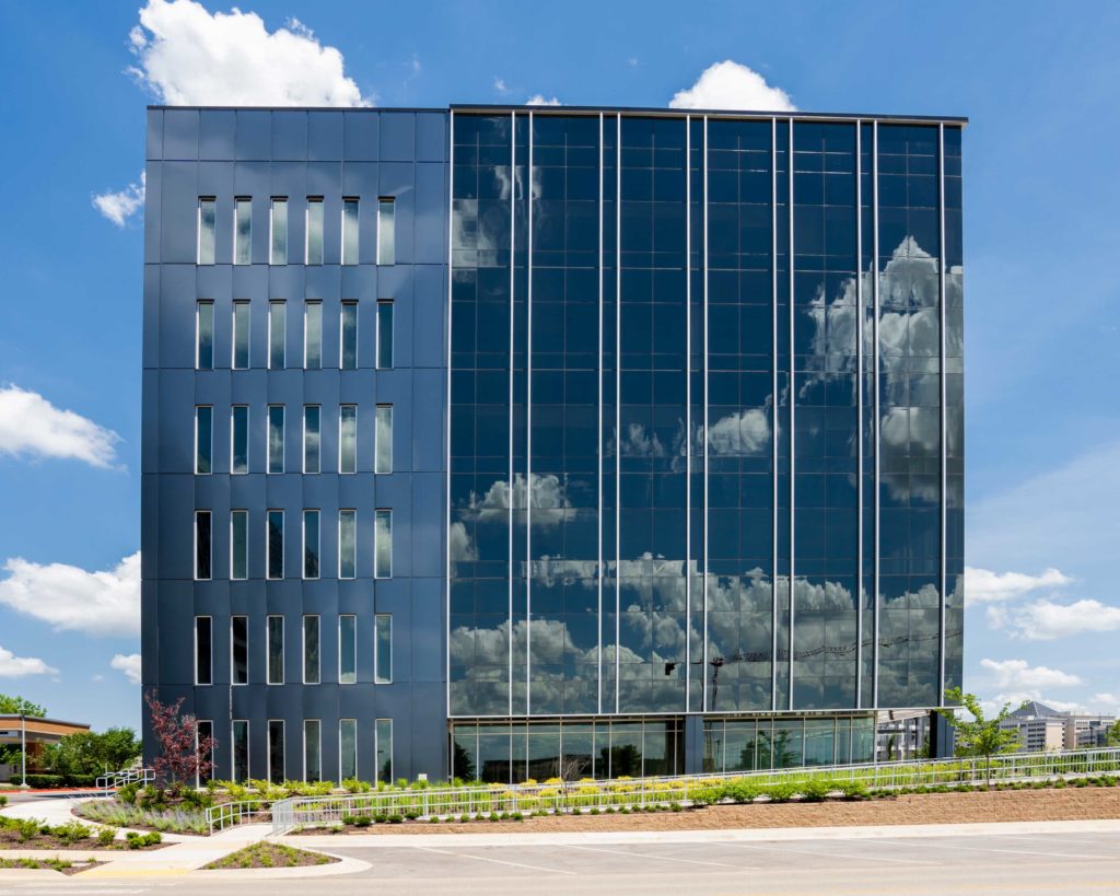“When you look at this area, Hunt Tower sets the tone,” said Allen, of the first office building on the site that also was designed by Core Architects. The 10-story Hunt Tower, which is clad in blue- and green-hued metal panels, was the first in the area to utilize metal panels, according to Allen, who said the majority of office buildings previously had utilized masonry. Core Architects collaborated with the Conway, Ark., studio of Georg Andersen Associates Inc. to select the colored metal panels.