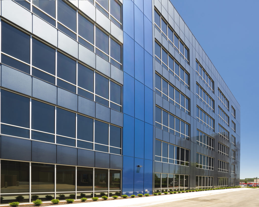 “This is a very modern design that utilizes simple lines,” said Allen, of the building that is designed in a 30-foot by 30-foot structural grid. “It looks as though we created two cubes and put them together (one clad in Anthracite Metallic Silver and the other in Custom Dayton Blue.) … We wanted natural light throughout the space, so glass is a very important element. You can see completely through this building.”