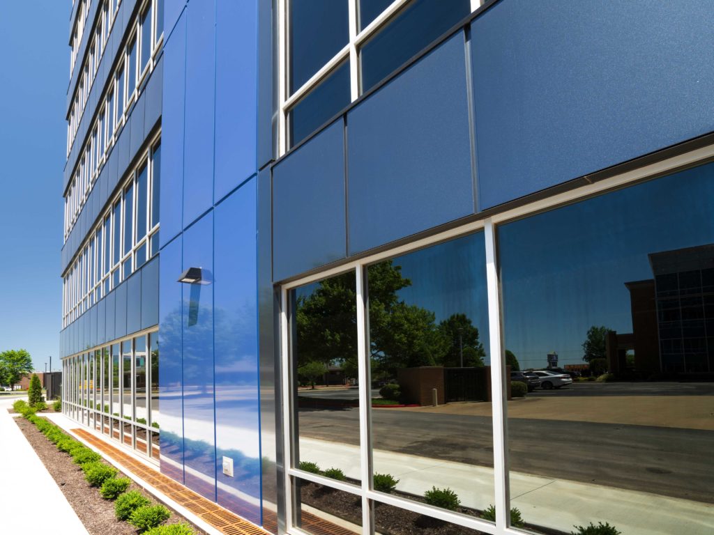 “The custom Dayton Blue really complemented the colored metal panels on Hunt Tower next door,” said Allen. “It allows Northgate Plaza to own the look without overshadowing Hunt Tower. 3A Composites was very responsive in providing this custom color. We used the blue to emphasize the main entry to the office building.”