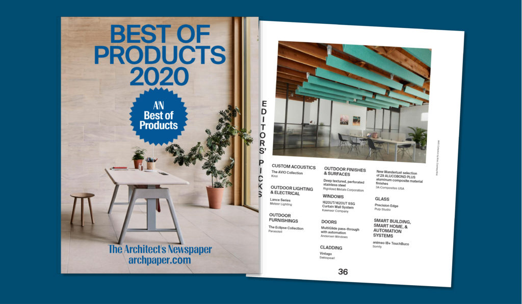 The 2020 Best of Products Awards are our most robust yet, and we’re thrilled to reveal the winners. With more categories than ever—31 in all—this year’s edition spans nearly every building, interior, and outdoor product category imaginable, from acoustics and fabrics to air barriers and timber cladding. Our discerning jurors brought their wide-ranging expertise to every one of these product types, assessing each on multiple bases, including aesthetics, performance, ease of installation, and value. After all was said and done, they had singled out one winner and up to two honorable mentions per category. The Architect’s Newspaper’s editors’ picks round out the esteemed group.