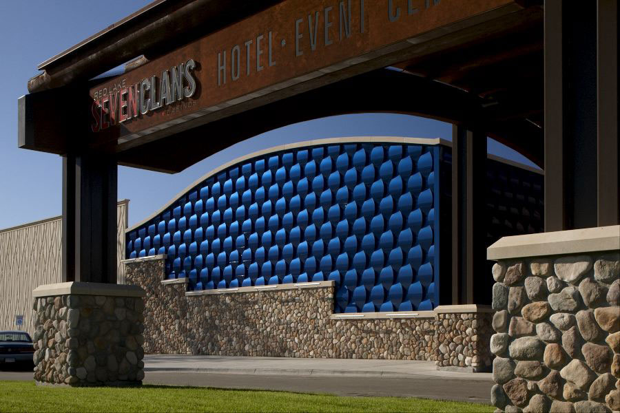 “Red Lake is very culturally important to the heritage of the Red Lake Nation,” said Wedge, who recreated the water effect in exterior cladding with an intricate pattern of hourglass shapes formed with ALUCOBOND® ACM in the Spectra Ocean color. A total of 3,250 square feet of ALUCOBOND® Spectra Ocean in the 4mm thickness was installed at Seven Clans Casino Red Lake.