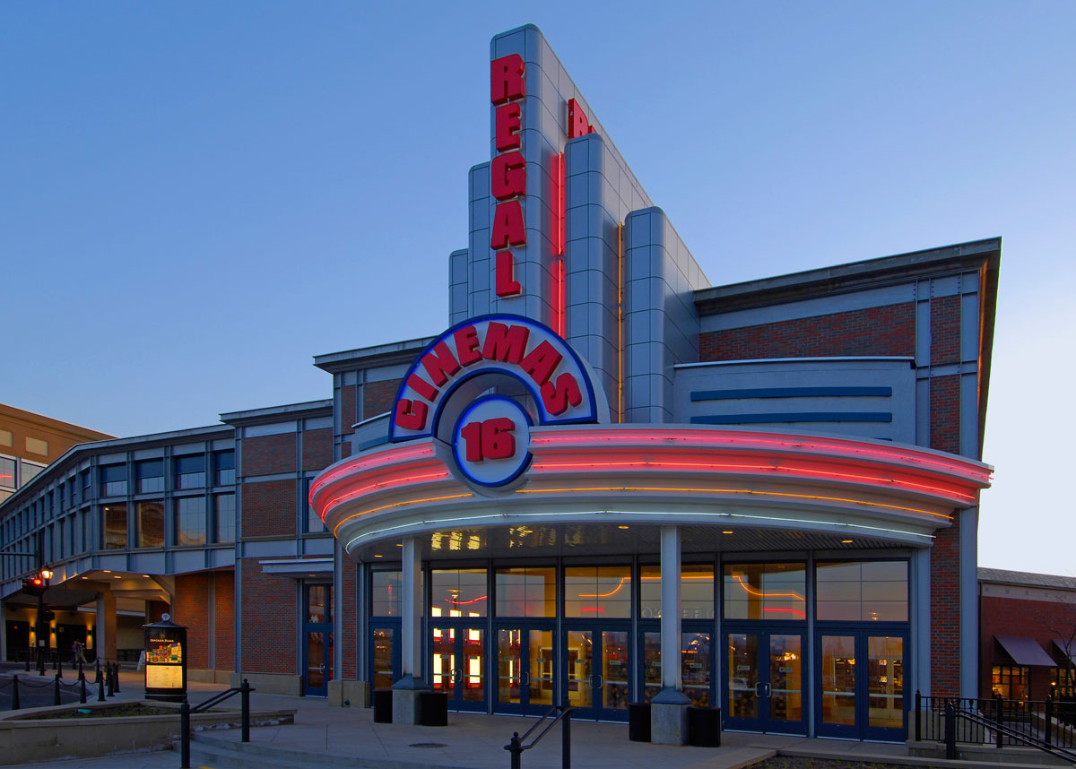 The cinema marquee at the Regal Cinema in Crocker Park, OH, (reference Westlake, OH) shines with its neon and lighted signage reflecting off its tasteful, sophisticated terraced tower of ALUCOBOND® composite metal panels. The marquee was designed to be “reminiscent of the Art Deco style of the 1920s and ’30s,” according to Paul Deutsch, AIA, Principal of Bialosky + Partners Architects of Cleveland, Ohio. The marquee draws attention, and movie fans, to the cinema as a diverse mix of other materials — including stucco, GRC (glass fiber reinforced cement), brick, and glass – add to the building’s visual interest. Retail storefronts in Crocker Park are designed to the needs of each tenant, while the overall design aesthetic results in “an exciting urban street level experience.”