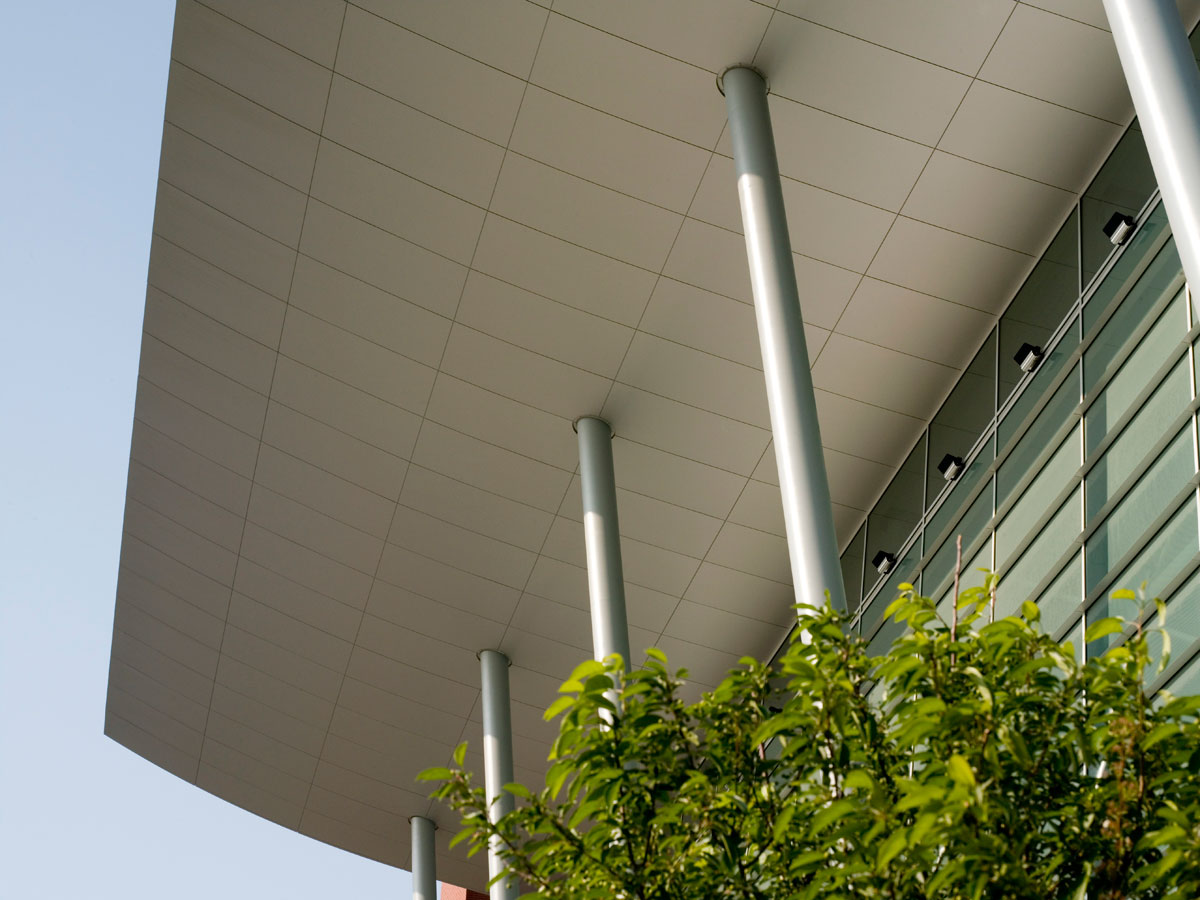 The striking cantilevered canopy was fabricated from ALUCOBOND® PLUS aluminum composite material (ACM) with a fire-rated core by 3A Composites USA in the custom LCH Silver color and 4 mm thickness by Sobotec Ltd., of Hamilton, Ontario, Canada.