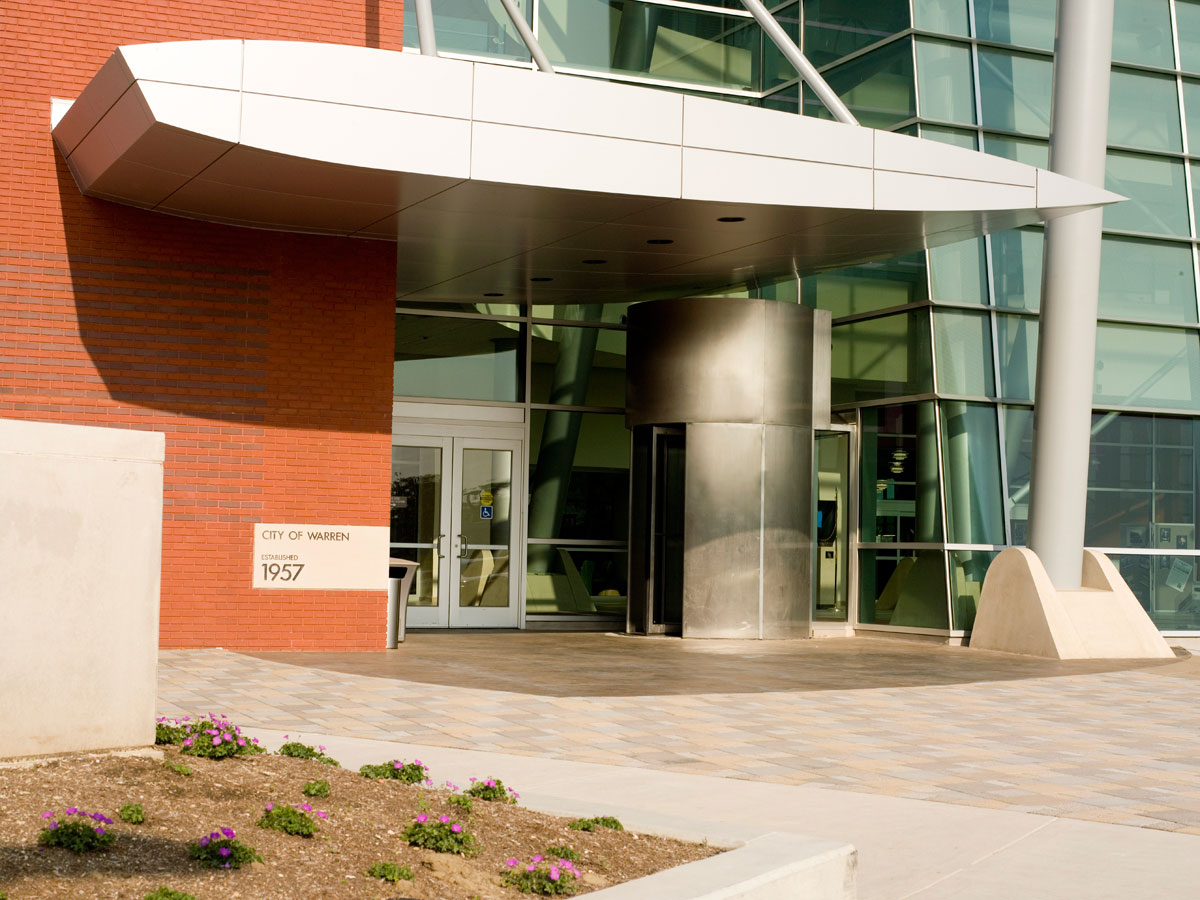 Although traditional exterior materials were chosen to construct the civic center – including brick, stone, glass, and metal – they “are boldly composed to create a new image for the City of Warren,” according to Neumann/Smith.
