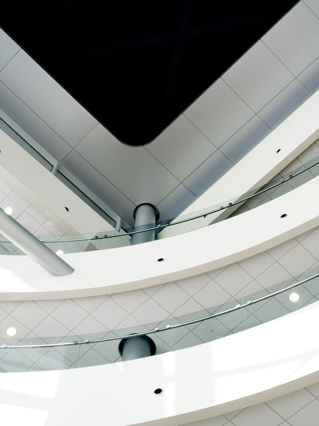 “Although the City initially envisioned a 19th Century design solution, we recalled the City’s roots as an important industrial and research and development town whose great icon was the GM Tech Center. The resulting design concept is a modern response to the Tech Center. To achieve a complementary ‘bookend’ to the Vehicle Engineering Center, the tallest building on the GM campus, the city hall was stacked over the library to increase its height to four stories. …A grand glass-walled atrium links the floors of the multi-storied building, serves as the indoor public space, and overlooks the new city square. A large cantilevered roof canopy extends out from the atrium over the plaza toward the city square. The structural columns and soffits create a modern formal front porch to the building and provide screening from the sun above.”
